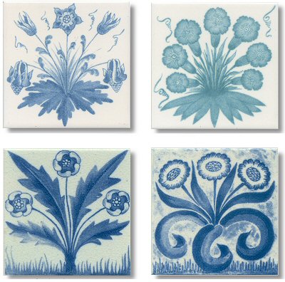 or restoration project. William Morris is perhaps better known for his fabric designs but he also created some remarkable tiles. These reproductions faithfully capture the charm and character of the originals. They include columbine, primrose, findon buttercup, findon daisy and nine square bough. Our