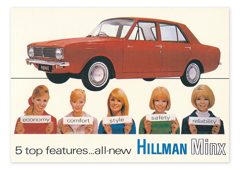 HILLMAN MINX - Stock Code: 01FF36. Postcard in the Robert Opie Collection card range. Our nostalgic postcard range now numbers over 300 cards, providing an unparalleled view of British consumer history. That is why they are considered by many to be collector's items. The Robert Opie Collection is the world's largest collection of British advertising images, providing a fascinating insight into the British way of life over the last 130 years.