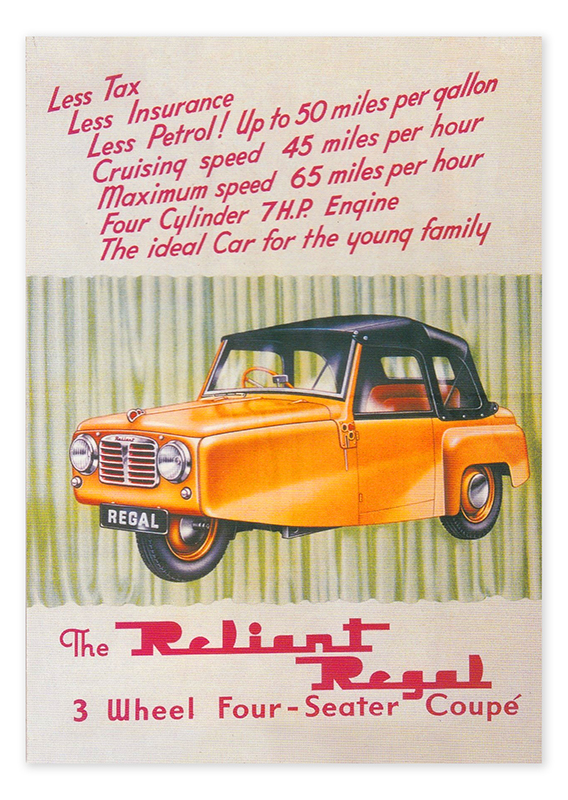 Post Card Reliant Regal - Stock Code: 01TRA03. Postcard in the Robert Opie Collection card range. Our nostalgic postcard range now numbers over 300 cards, providing an unparalleled view of British consumer history. That is why they are considered by many to be collector's items. The Robert Opie Collection is the world's largest collection of British advertising images, providing a fascinating insight into the British way of life over the last 130 years.