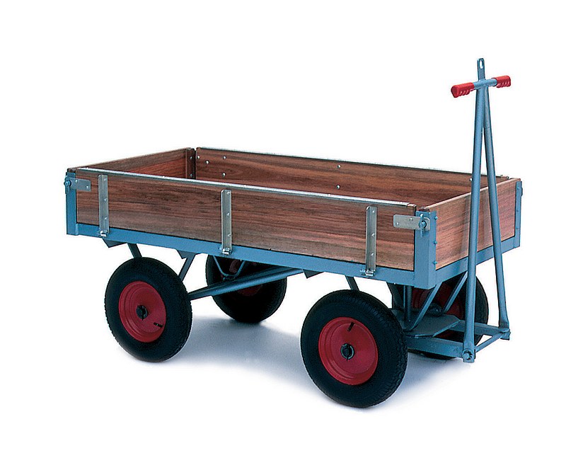 Our Stubbs estate carts with optional tow hitch are strong, but lightweight, and are designed to save you a lot of wasted effort. These carts are called Estate Carts (they are often deployed on large estates and farms), they are also ideal for a whole variety of uses, such as in domestic gardens by members of the public who are looking for something that is a step up from the types of carts that are generally available, and a bit special in terms quality, style and durability. Our heavy-duty estate carts have a large carrying platform. With four 40cm pneumatic tyres you will not need to lift your load (as you do with a barrow), you just pull it. Also, the smooth action rack steering means your cart won't tip over under heavy loads, even when you are turning corners. Our carts are constructed using heavy-gauge steel. They are ideal for shifting pots and planters, hauling logs, paving slabs and soil, or simply for carrying around garden tools and equipment. These are not the only four-wheeled carts available, but they are the best you'll find, and their traditional timeless steel and wooden construction style are a joy to behold - we are very happy to recommend them! - Loads up to 1000 Kg