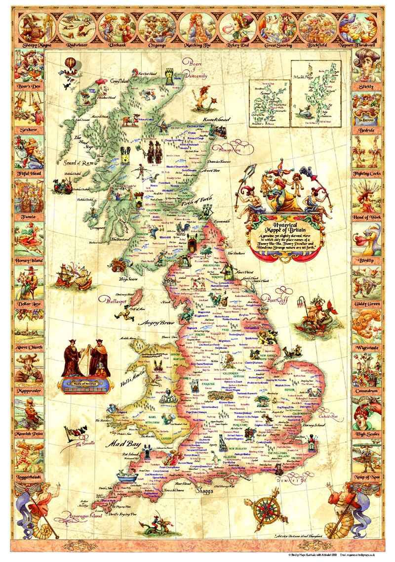 A slightly skewed view of Britain, from Birdlip Maps, in which only the place names of a Funny Ha-Ha, Funny Peculiar and Wondrous Strange nature are shown. Over 500 genuine and current place names. Beautifully illustrated in the style of an antique map with a humourous slant. Suitable for framing - fits standard 50 x 70cm size. - Beautifully Drawn