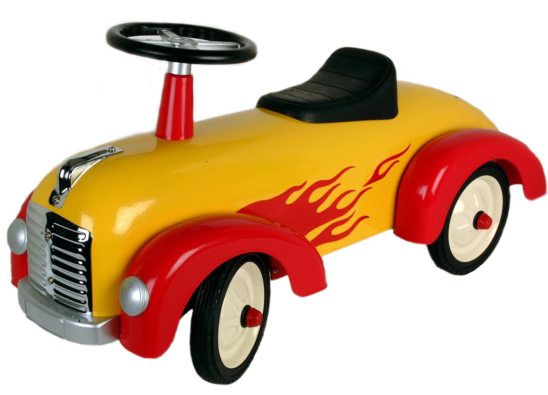Handbuilt foot-to-floor ride-on car in strong steel, with a chrome grille and smooth-running rubber tyres. A beautifully-finished car in yellow and red, ideal for the young motoring enthusiast. Suits 1 to 3 years old. - Based on original 1950s designs