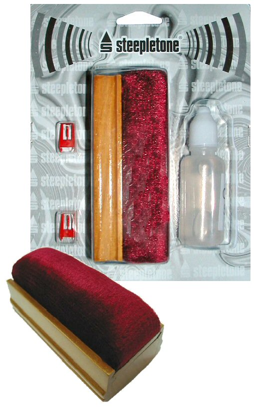 Essential accessories for Steepletone record players. Includes anti-static velvet & wood record cleaning cleaning brush, 25cc Bottle of Cleaning Fluid for cleaning records, and 2 replacement sapphire syluses type SSTY1. - Genuine Steepletone accessories